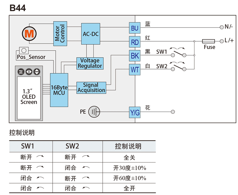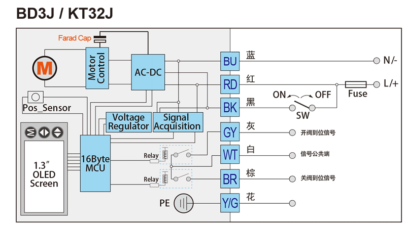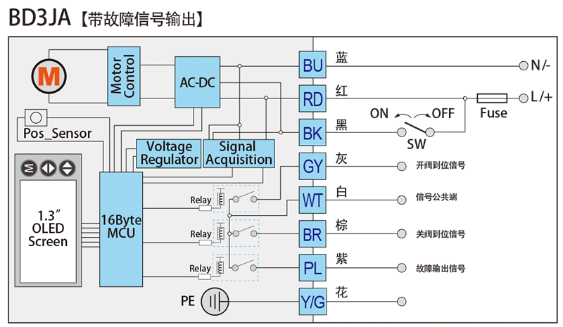 SW切換至BK,電動執(zhí)行器將逆時針旋轉(zhuǎn),到位后 WT與GY接通,給出開閥到位信號。